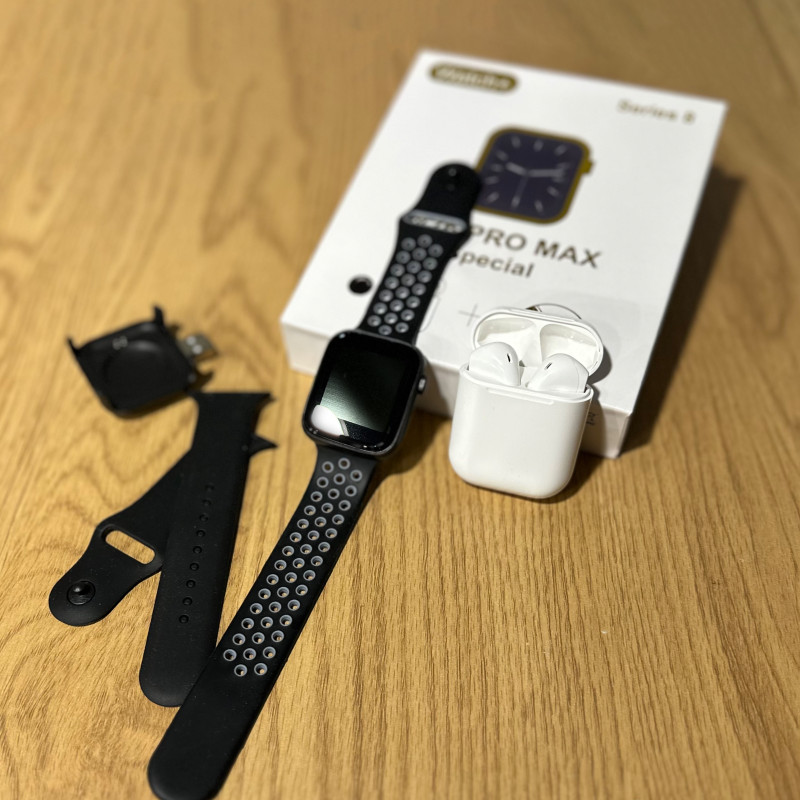 Цей універсальний набір поєднує сенсорний смарт-годинник у чорному кольорі, два ремінці (чорний та чорно-сірий) і бездротові навушники-вкладиші білого кольору. Годинник підтримує базові фітнес-функції, показ часу, повідомлення та має зручний силіконовий ремінець. У комплекті є зарядка для годинника.