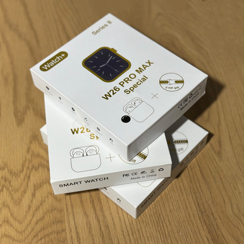 Набір включає сенсорний смарт-годинник у кольорі rose gold, два силіконових ремінці (рожевий і рожево-білий), а також білі бездротові навушники-вкладиші. Годинник має приємний дизайн, підходить для щоденного носіння та комплектується зарядним кабелем для годинника.